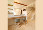 室内の床はオール無垢材で踏み心地の良い空間を漂わせ、造り付家具もあり機能的にも充実したつくりとなり、何よりも住む方の想いでかわいい雰囲気を醸し出し温かみのある家となりました。